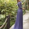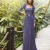 Abito da cerimonia in mussolina. Scollo quadrato e schiena coperta con bottoni. Maniche di pizzo con piume sulle spalle. Cintura con fibbia di strass.
