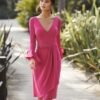 Abito da cerimonia crêpe. Scollo a V e schiena coperta con cintura di strass. Maniche 3/4.