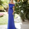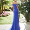 Abito da cerimonia in raso stampato. Scollo e schiena avvolgenti. Con fiore in vita.
