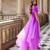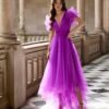 Abito da cerimonia midi confezionato in tulle. Modello Marfil Barcelona con scollo a V, schiena scollata e maniche fantasia.