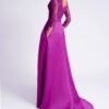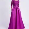Abito da sposa redingote lungo in stile classico confezionato in raso con inserti di pizzo, con ampia gonna con le tasche e gancetto di strass sulla cintura. Abito Rosa Clará Cocktail con scollo a barchetta sul davanti e schiena a V, con orlatura di blonda.