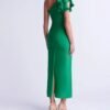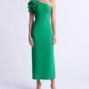 Abito da cerimonia dritto midi in stile classico confezionato in crêpe, con dettaglio di volant sulla manica. Outfit Rosa Clará Cocktail con scollo asimmetrico.