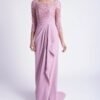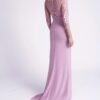 Abito da cerimonia dritto lungo, in stile classico, in crêpe con inserti di pizzo e gonna asimmetrica con volant. Completo Rosa Clará Cocktail con scollo a barchetta quadrato, schiena coperta con trasparenze e dettaglio di bottoni, con le maniche francesi.
