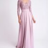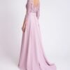 Abito da cerimonia dritto lungo, in stile classico, in crêpe con ampia gonna a pieghe con le tasche. Outfit Rosa Clará Cocktail con scollo a V sul davanti e sulla schiena e maniche francesi.