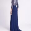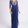 Abito da cerimonia dritto, lungo ed elegante confezionato in georgette con corpetto in tessuto a rete ricamato di strass e plissé su gonna e cintura. Outfit Rosa Clará Cocktail con scollo a V sul davanti e schiena coperta, con maniche francesi.