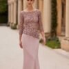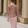 Abito da cerimonia lungo in stile elegante. Realizzato in crêpe con strass. Con scollo a barchetta e maniche francesi.