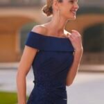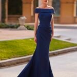 Abito da cocktail lungo in stile semplice. Realizzato in crêpe satin con dettagli di strass. Con scollo sotto le spalle.