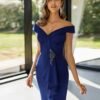 Abito da gala lungo in stile sensuale. Realizzato in crêpe con dettagli di strass. Con scollo off-shoulders e gonna con spacco frontale.