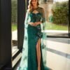 Abito da gala lungo in stile elegante. Realizzato con paillettes. Con scollatura dritta, spalline scese e una mantella in tulle con applicazioni di strass.