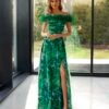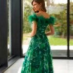 Abito da damigella d’onore lungo in stile moderno. Realizzato in tulle con piume. Con scollo sotto le spalle.