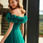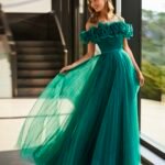 Abito lungo in stile fantasia. Realizzato in tulle. Con scollo sotto le spalle
