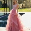 Abito da sera lungo in stile romantico. Realizzato in tulle con dettagli in pizzo e strass. Con scollo a V e schiena coperta.