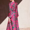 Abito lungo in stile romantico. Realizzato in raso stampato. Con scollo a V, schiena a goccia e maniche a sbuffo.