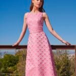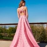 Abito da invitata lungo in stile classico. Realizzato in broccato stampato. Con scollo a barchetta, schiena scollata con spalline e fiocco ornamentale.