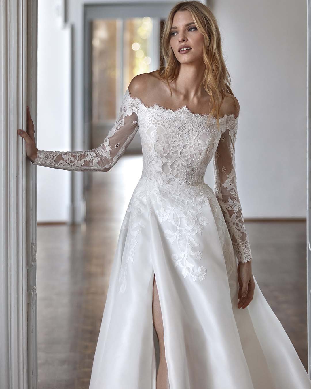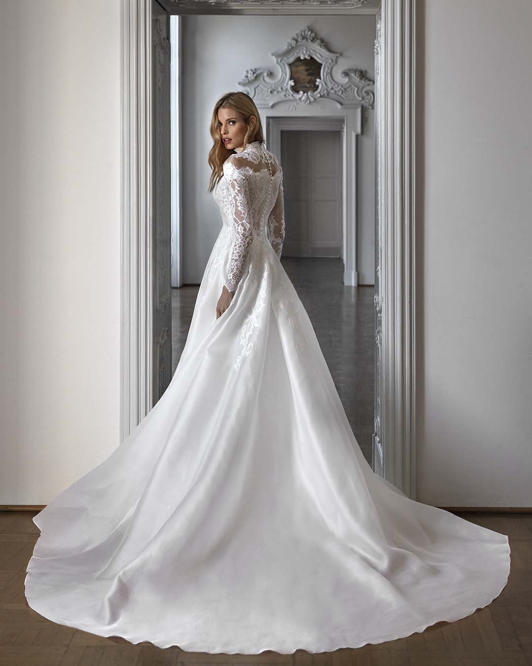 Abito da sposa semi ampio in organza in seta, con scollo a barca e delicate maniche in pizzo che aggiungono un tocco di romanticismo. La silhouette slanciata è impreziosita da uno spacco elegante che valorizza la figura, mentre il collo alto staccabile permette di trasformare il look con naturalezza. Un modello versatile che unisce raffinatezza e modernità.