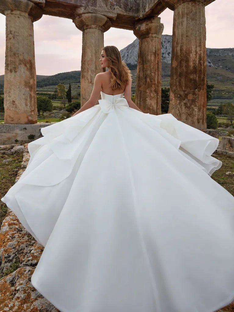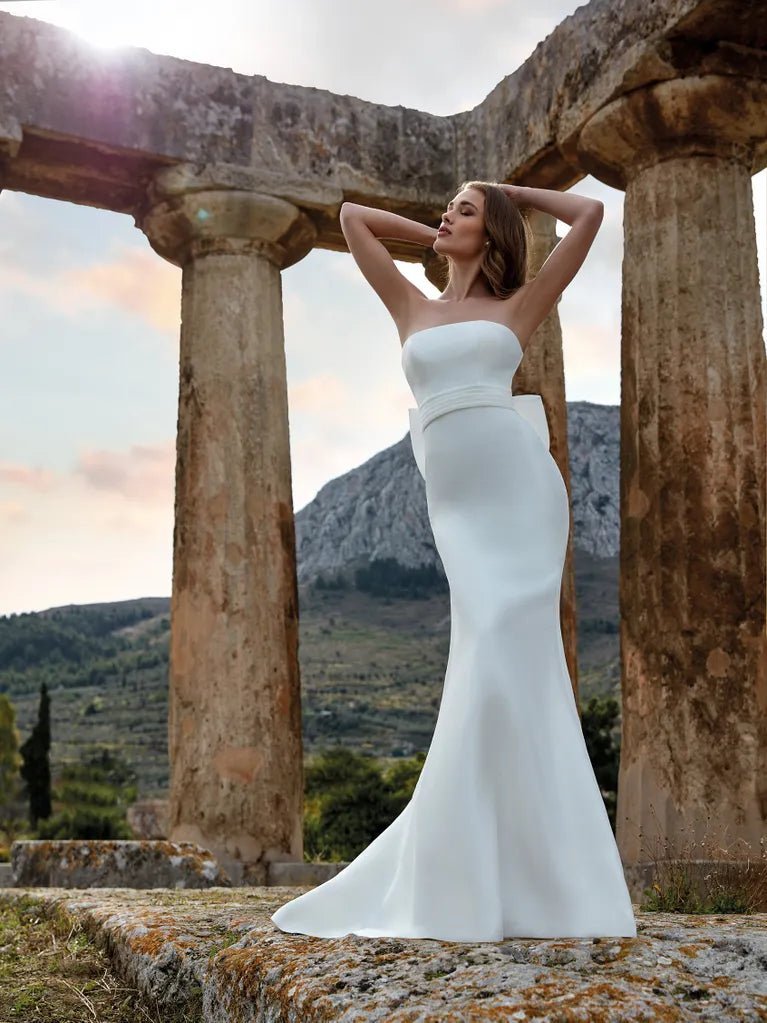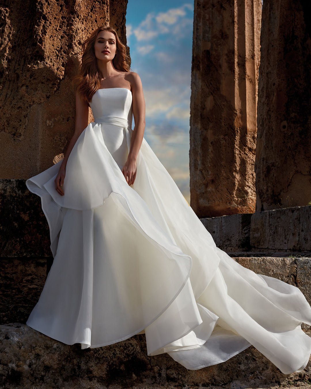 Abito da sposa a sirena dal fascino minimal in organza e mikado senza spalline. La sopragonna crea movimento e sublima l’effetto scenico e la coda dell’abito.