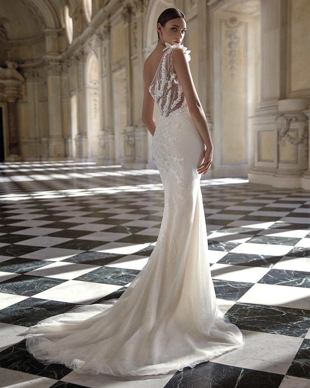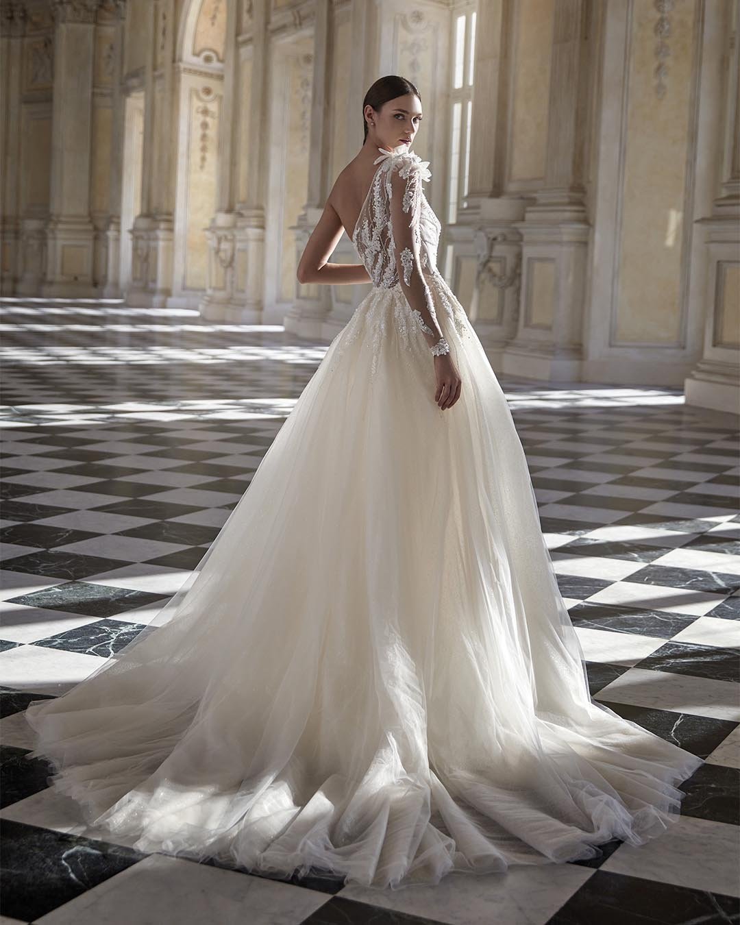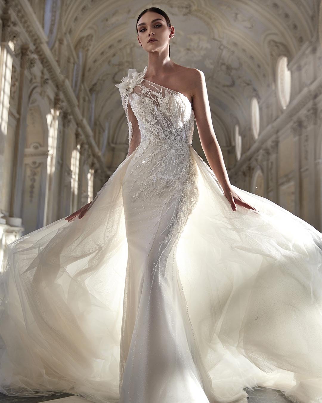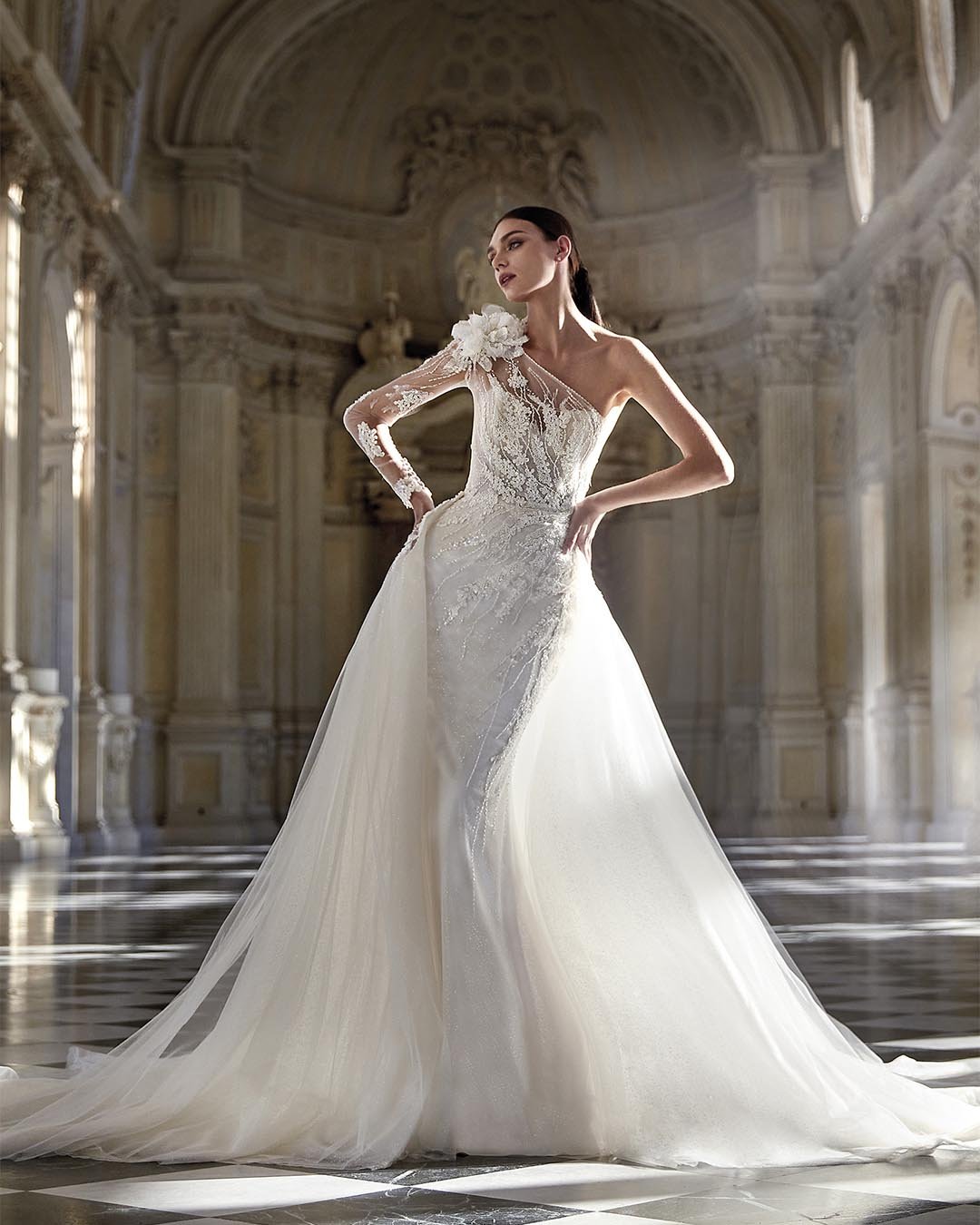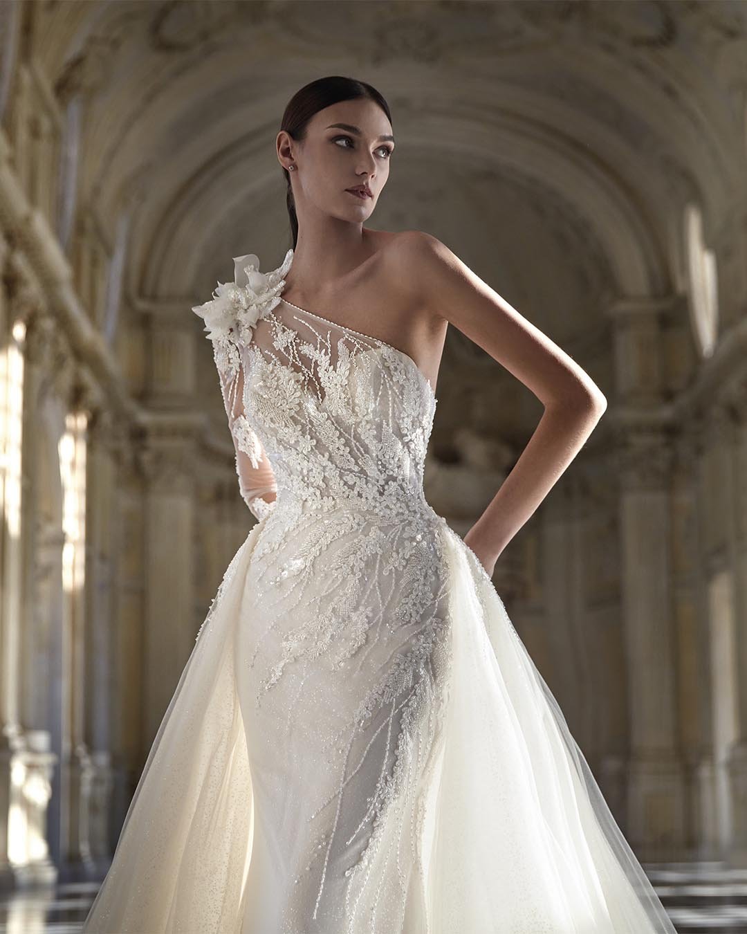Abito da sposa a sirena dal carattere sensazionale, che scolpisce la parte superiore del corpo con una raffinata scollatura asimmetrica. La ricca decorazione di perline e fiori 3D aggiunge luminosità e fascino, mentre la gonna in tulle pregiato, composta da strati sottili e leggeri, regala movimento e delicatezza. Il modello è completato da maniche illusion staccabili e da una sopragonna trasformabile, perfetta per creare volume e rinnovare il look in ogni momento della cerimonia.