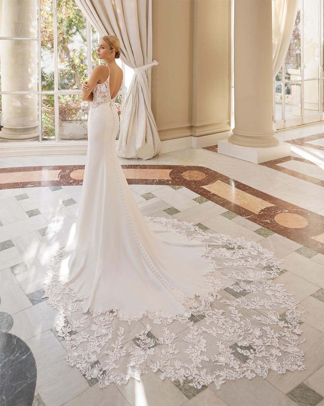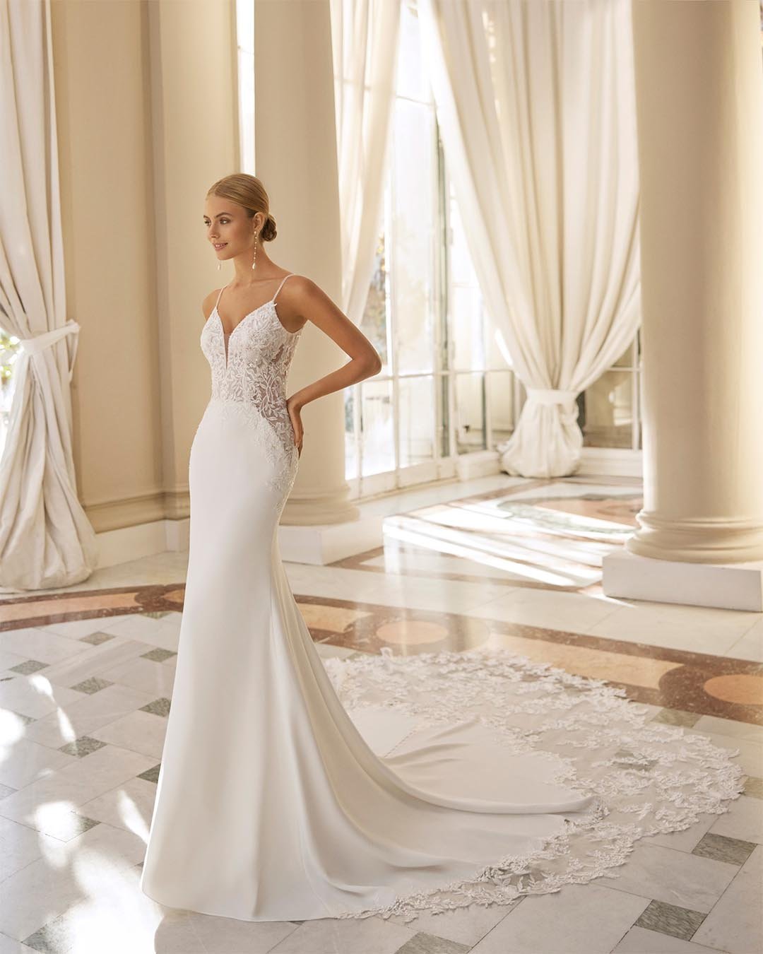 Abito da sposa a sirena, una creazione che unisce sensualità e raffinatezza. Il corpetto in pizzo chantilly, impreziosito da ricami di strass e sottili spalline in cristalli, cattura la luce con eleganza, mentre la gonna in crêpe scivola fluida fino a un sontuoso strascico decorato in pizzo. Un modello che esalta la femminilità con grande classe.