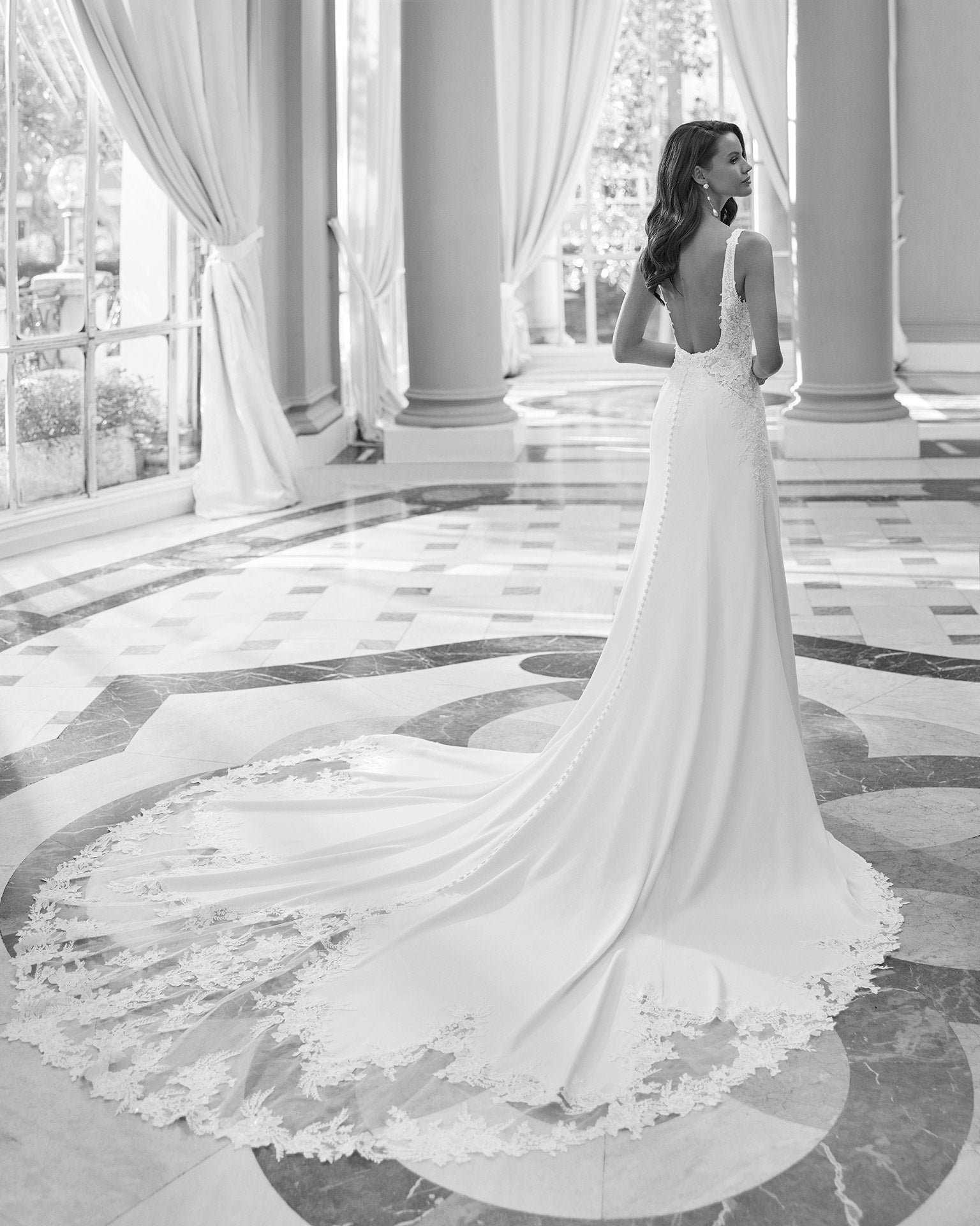 Sensuale abito da sposa sirena confezionato in crêpe elasticizzato e pizzo con strass. Modello Aire Barcelona con scollo quadrato e inserti di pizzo sullo strascico.