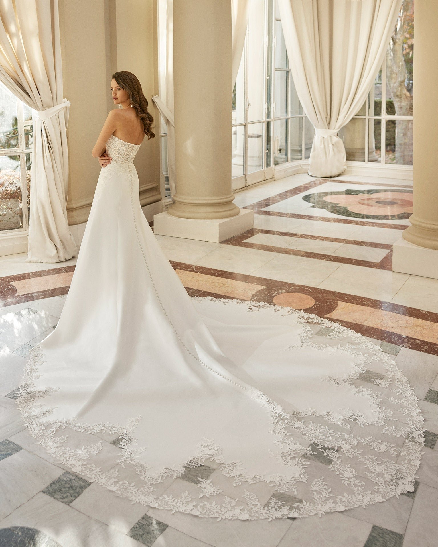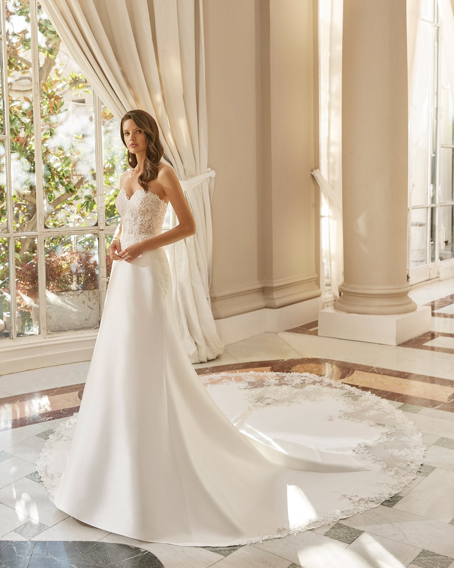 Abito da sposa redingote in stile classico confezionato in mikado elasticizzato e pizzo con strass. Modello Aire Barcelona con corsetto con scollo a cuore e inserti di pizzo sullo strascico. Versione senza push-up.