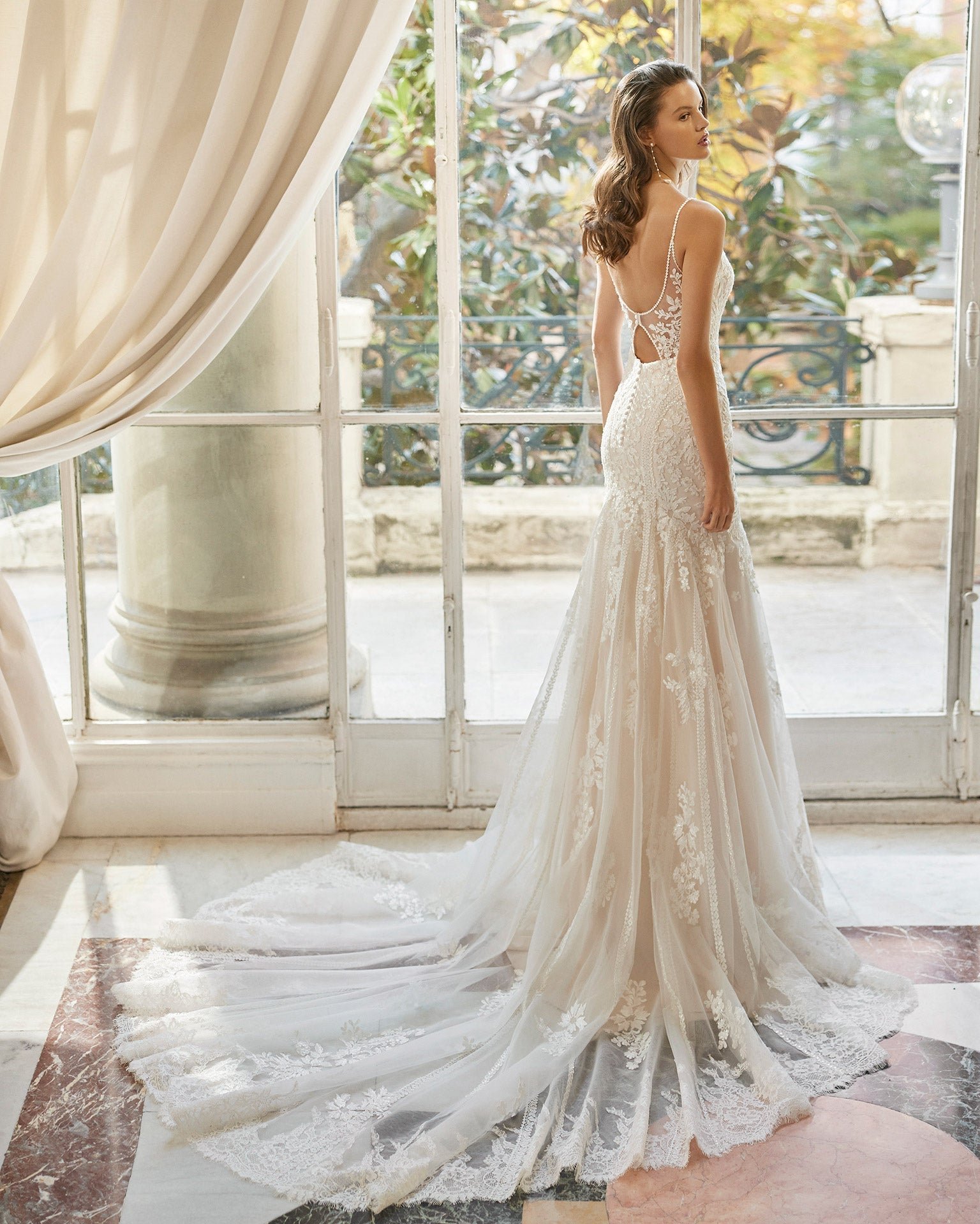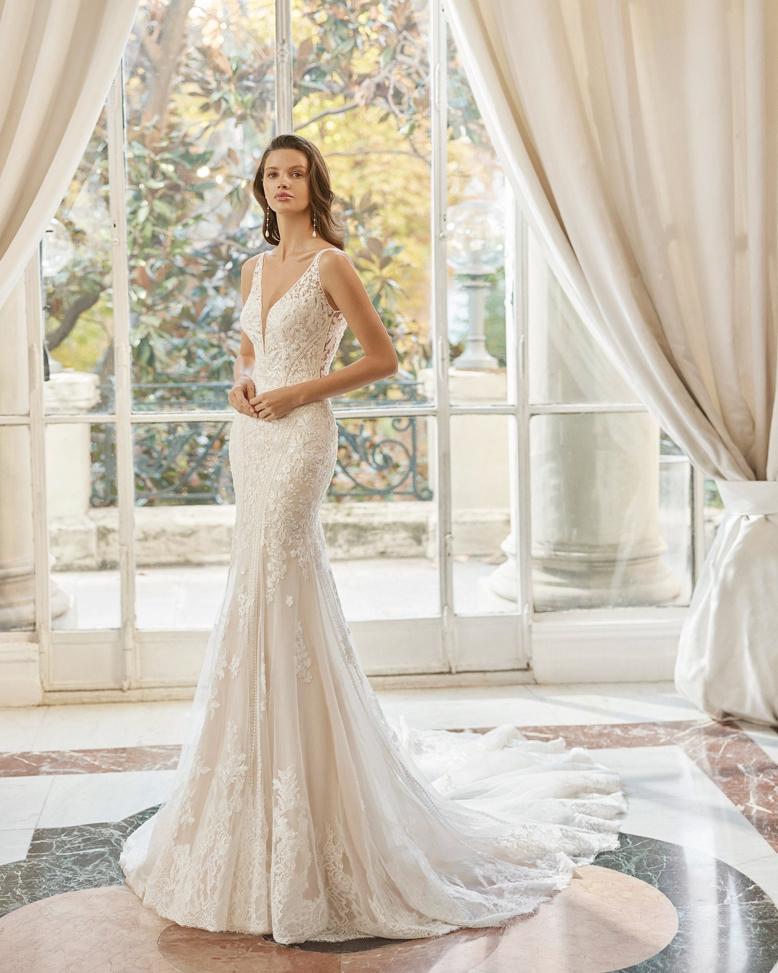 Romantico abito da sposa sirena confezionato in pizzo con strass. Modello Aire Barcelona con scollo a V e schiena scollata.