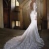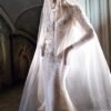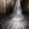 Abito da sposa moderno che unisce lo stile sirena e principessa, arricchito da un raffinato pizzo. Il corpetto con scollo a V e le maniche lunghe semitrasparenti creano un look ricco di glamour, mentre la schiena trasparente con bottoncini dall’effetto scultoreo dona un fascino sensuale. La sopragonna in velo rimovibile aggiunge un tocco romantico e permette di trasformare l’abito in un modello versatile e scenografico.