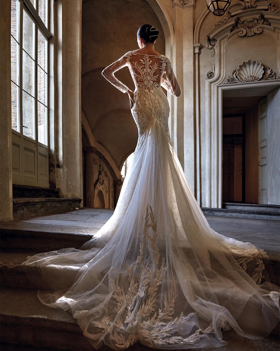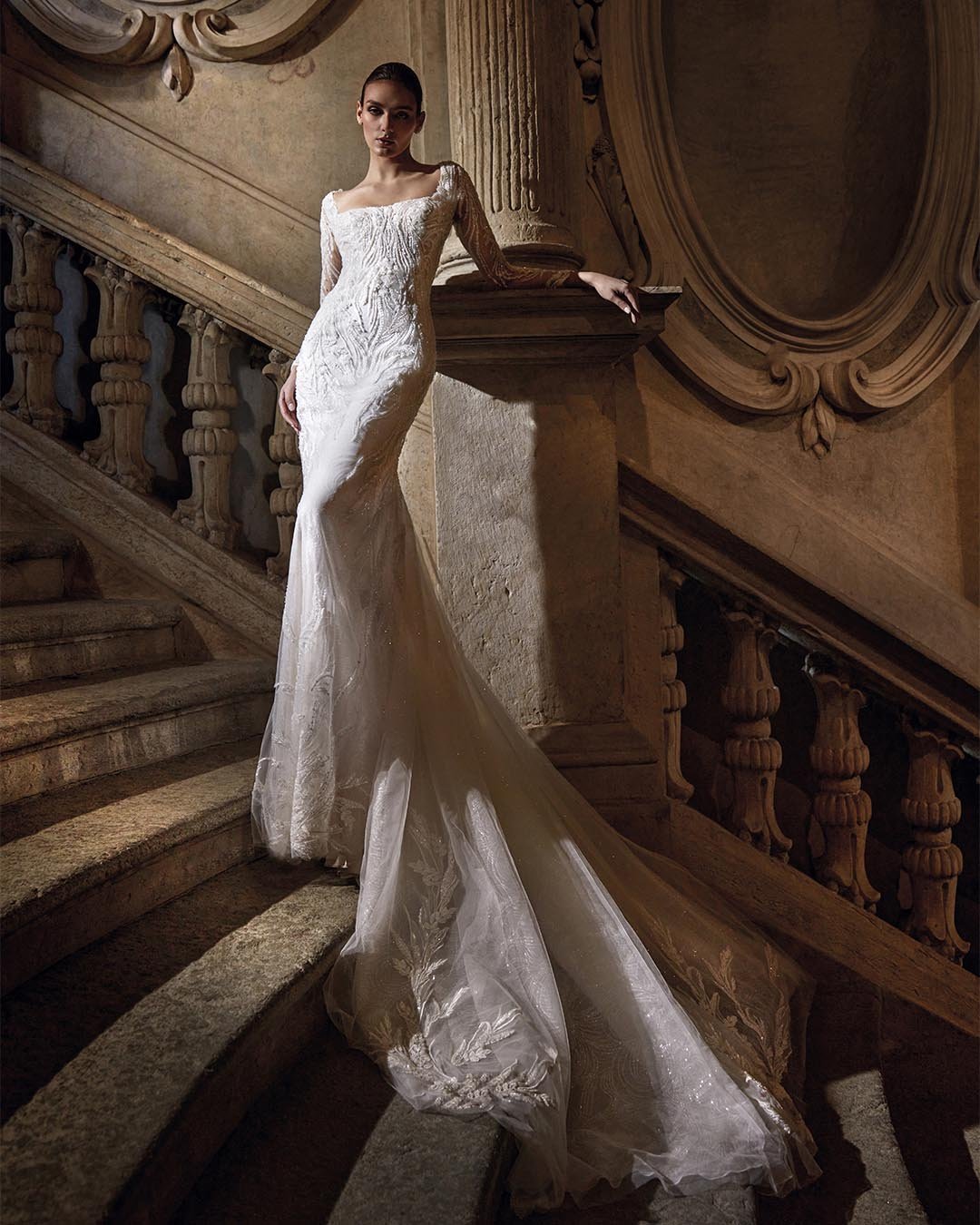Abito da sposa a sirena con raffinata scollatura quadrata che valorizza il décolleté in modo elegante e moderno. Realizzato in tulle e pizzo, è impreziosito da delicate applicazioni di perline che illuminano la silhouette. Le maniche lunghe donano raffinatezza e armonia, mentre la linea aderente del taglio a sirena esalta con grazia le forme.