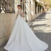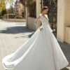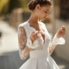 Abito da sposa classico di alta moda in pizzo, pizzo con strass e broccato brescia. Scollo e schiena a V e maniche lunghe di pizzo con volant. Gonna con pieghe in vita e tasche.