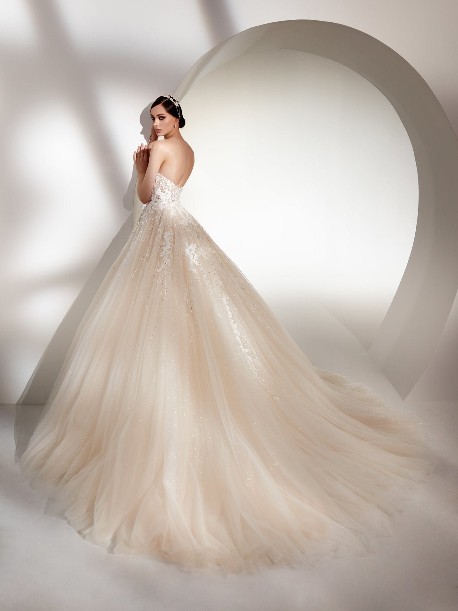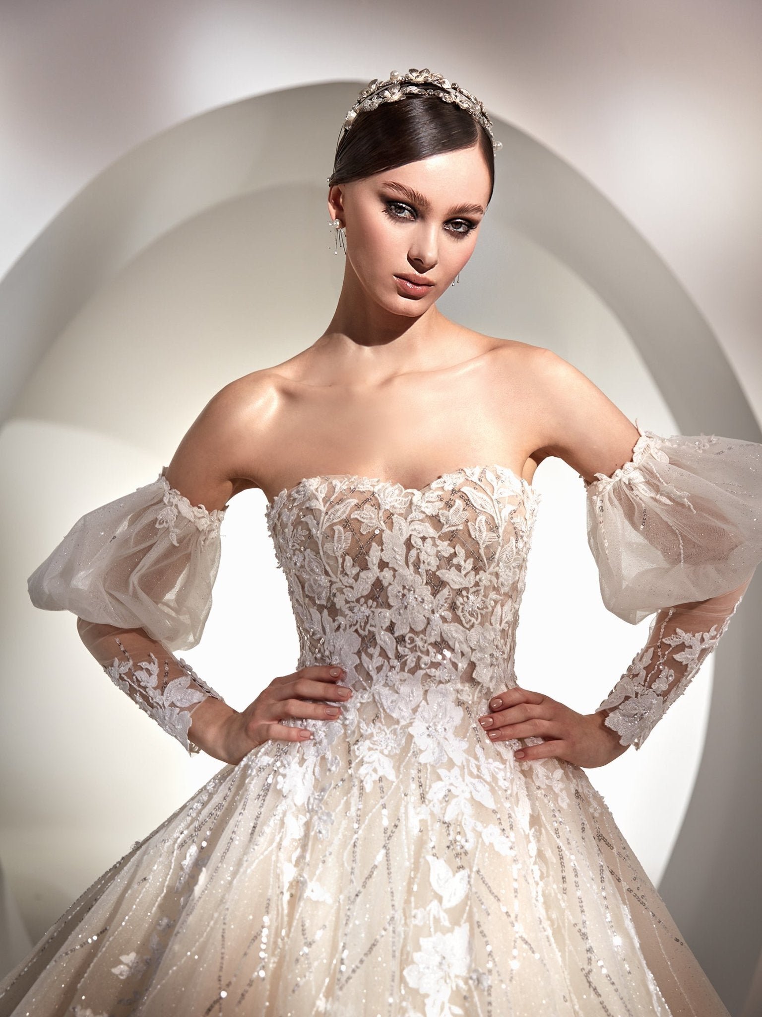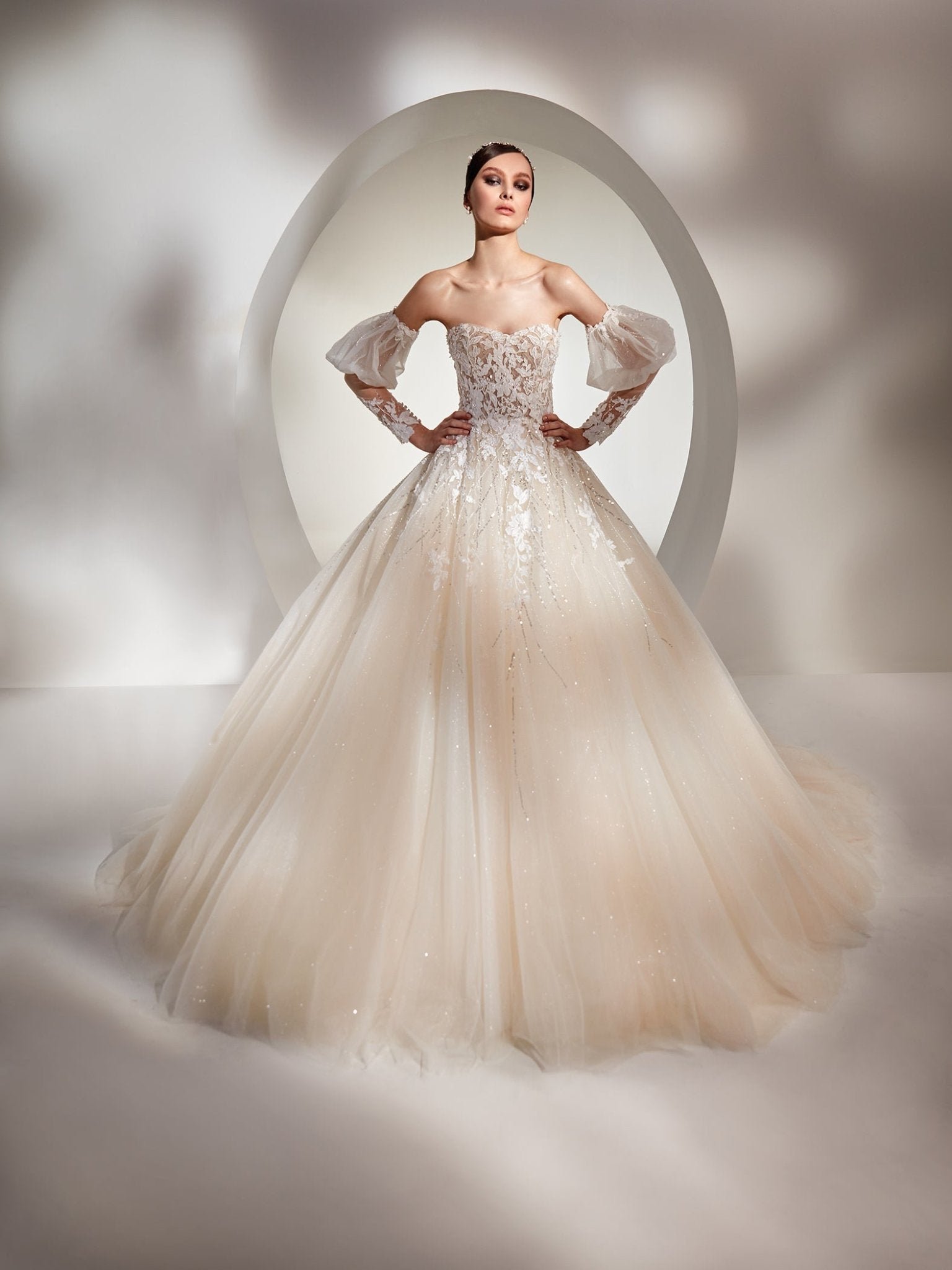 Abito da sposa principesco con voluminosa gonna in glitter tulle avorio. I ricami di pizzo e le applicazioni preziose creano un leggero effetto 3d e illuminano il corpino con scollatura arrotondata. Le maniche staccabil subimano il glamour di questo abito.