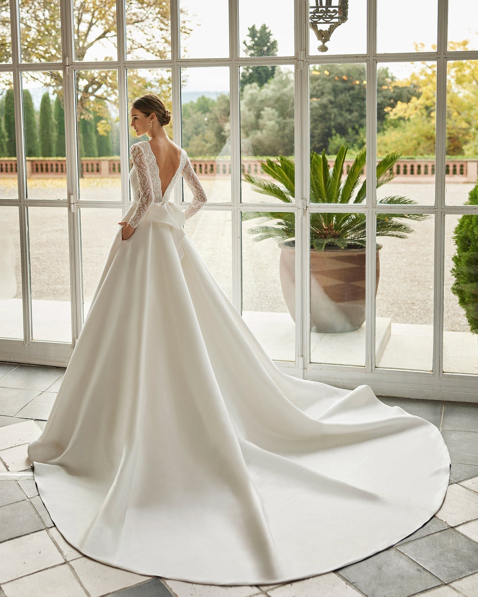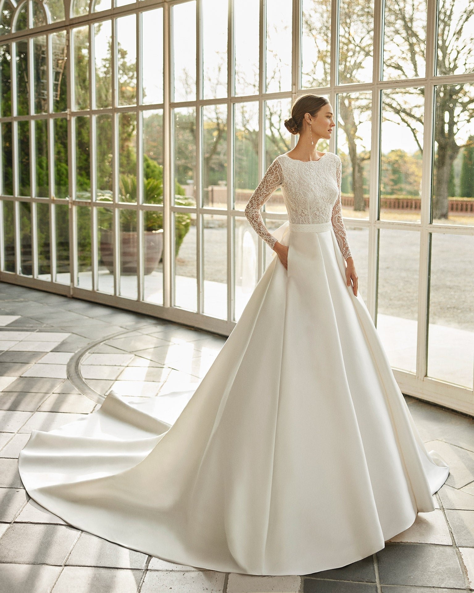 Modello Aire Barcelona con corpetto in pizzo con strass, scollo a barchetta sul davanti e a V sulla schiena, maniche lunghe e gonna a pieghe.