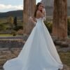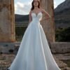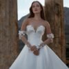 Elegante abito da sposa in mikado dalla linea ad A senza spalline. I ricami di fiori 3D e perline impreziosiscono la scollatura a cuore e i manicotti staccabili in tulle completano il look con romanticismo.