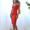 Abito a tubino in mikado elasticizzato, con gonna al ginocchio, maxi cintura annodata, corpetto in tulle cristallo, scollatura effetto nudo e maniche a tre quarti decorate con applicazioni floreali.