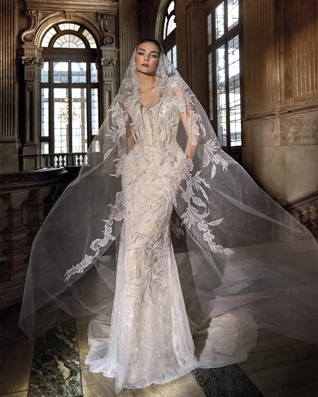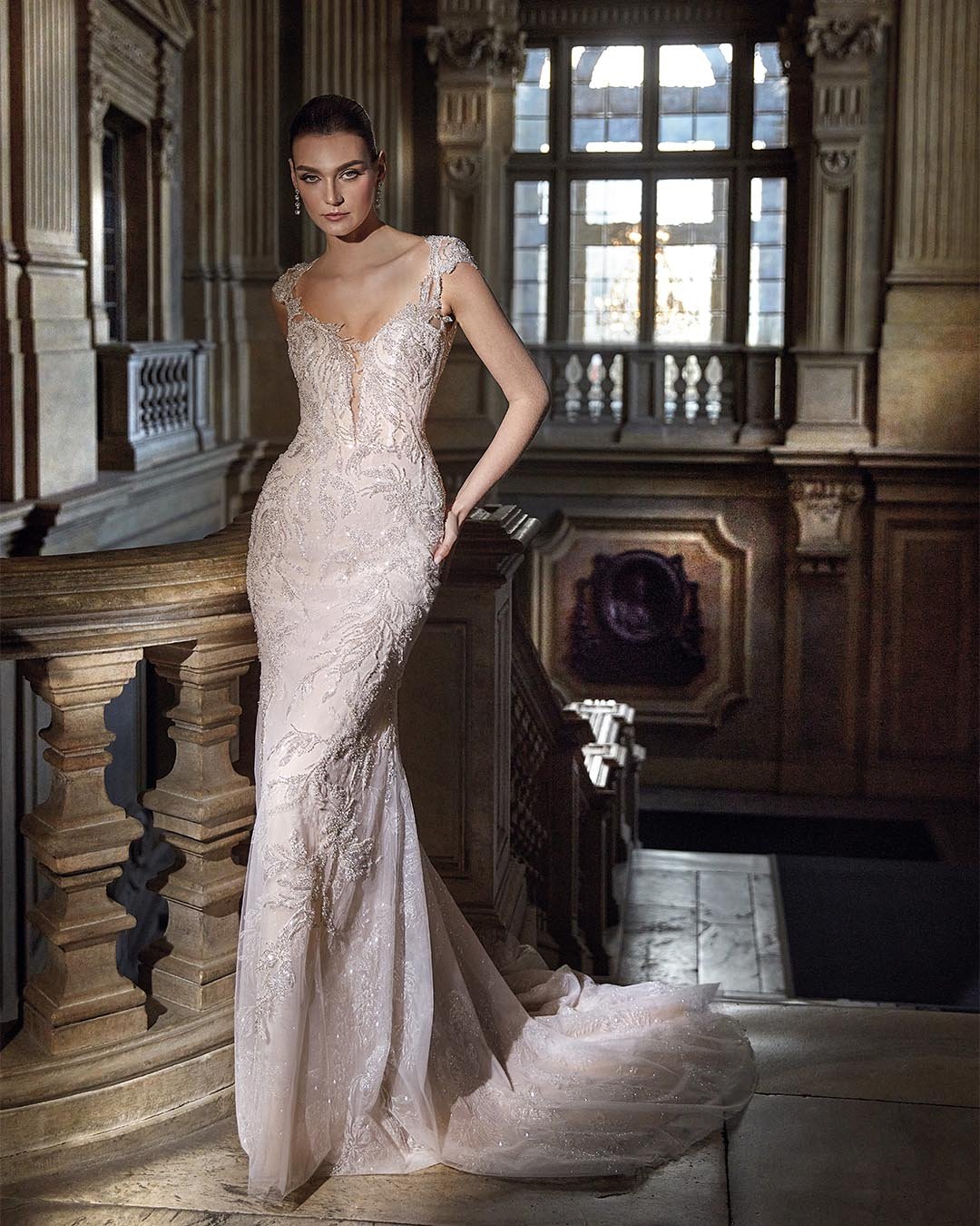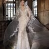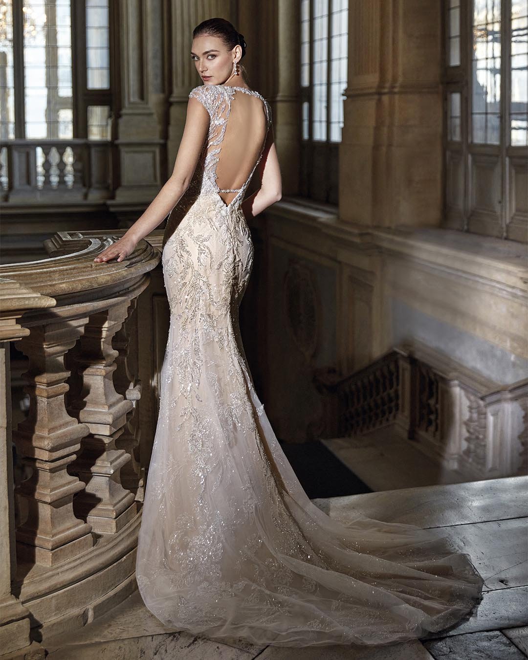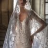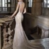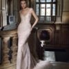 Abito da sposa a sirena interamente realizzato in pizzo ricamato con preziose perline. La base nude, arricchita da delicati glitter effetto “polvere di stelle”, dona una luminosità unica all’intera creazione. Il corpetto con profonda scollatura a V è impreziosito da raffinate spalline gioiello leggermente scese, che si uniscono a un’ampia scollatura sulla schiena, conferendo sensualità ed eleganza assoluta.