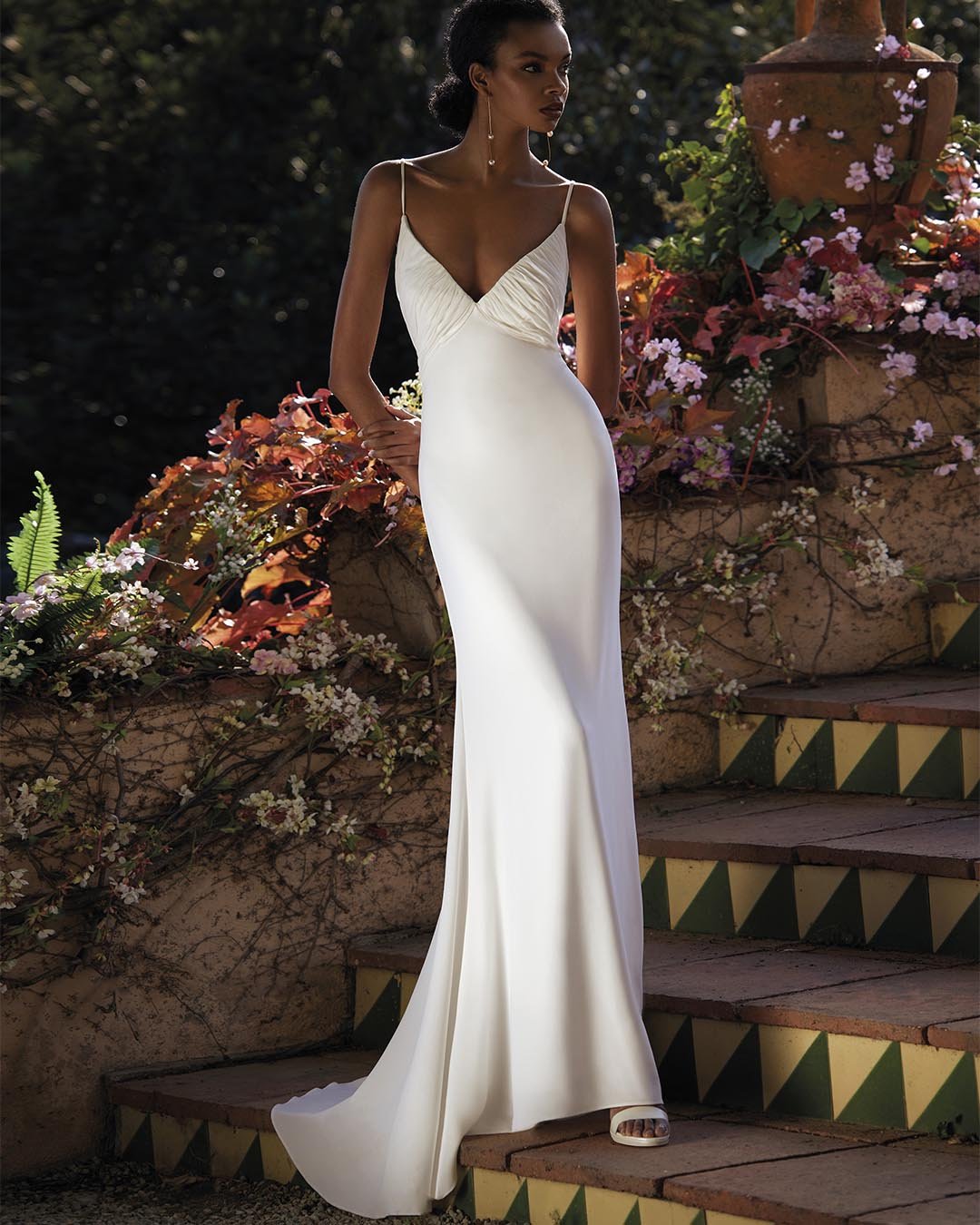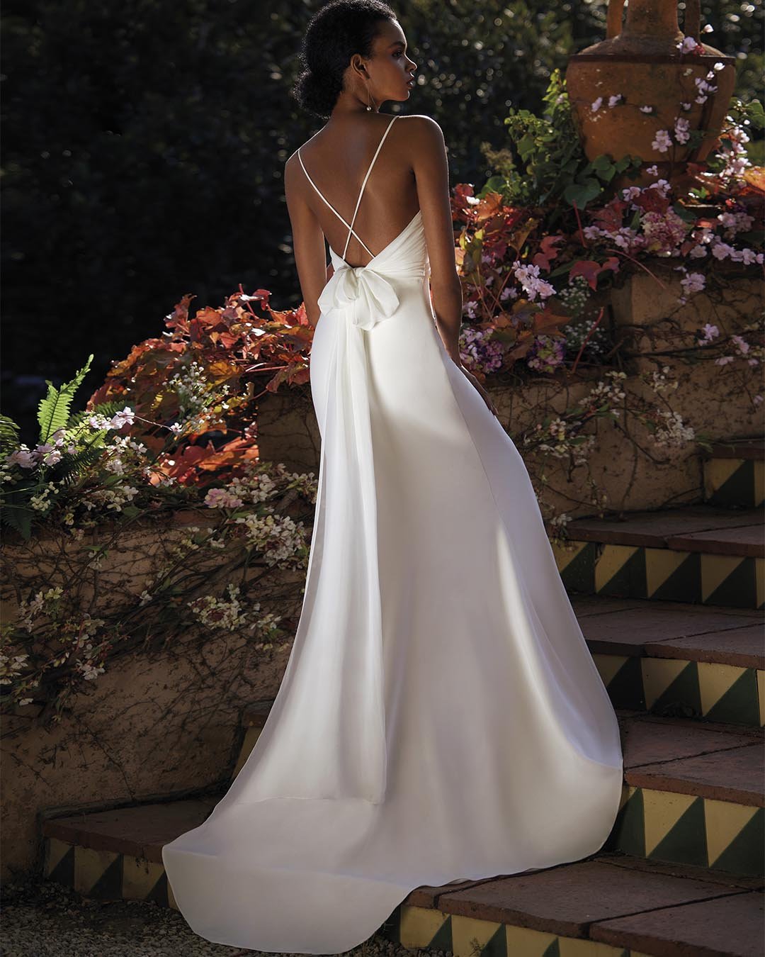 Abito da sposa a sirena in crêpe, impreziosito da un raffinato scollo a V che valorizza il décolleté con eleganza. Le bretelline sottili donano leggerezza al corpetto drappeggiato, mentre la schiena scoperta con spalline incrociate e fiocco in tessuto regala un dettaglio romantico e moderno. La linea fluida del crêpe accompagna con armonia i movimenti della sposa, terminando in uno strascico delicato che completa il look con sobria raffinatezza.