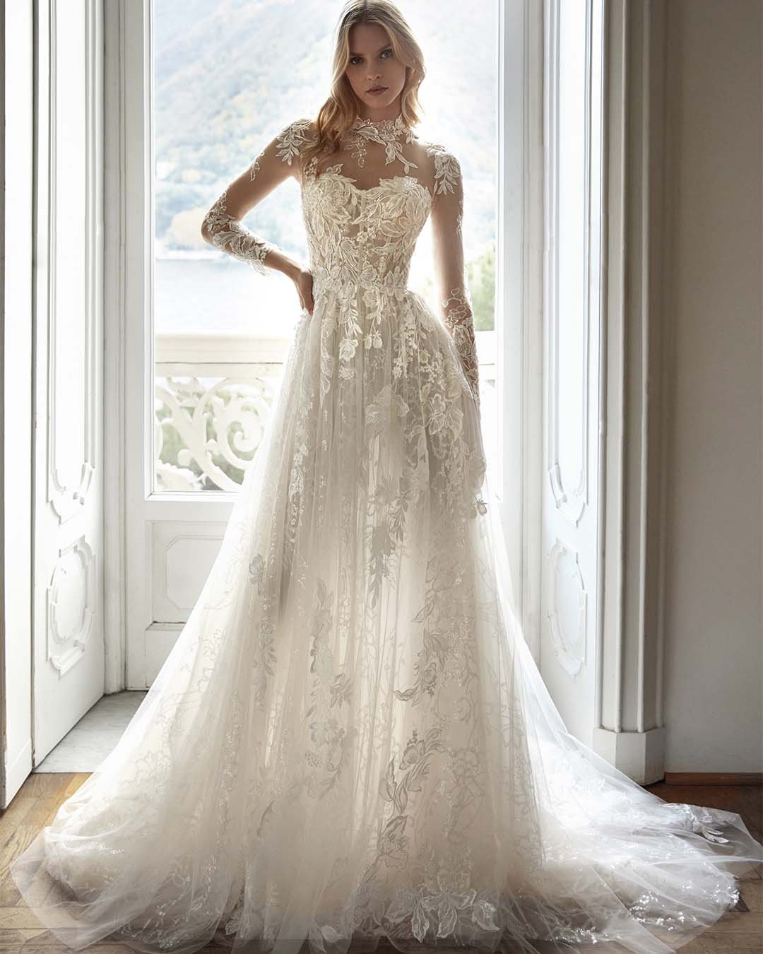 Abito da sposa in tulle e pizzo, caratterizzato da un corpetto effetto tattoo con ricami floreali che si estendono sulle maniche lunghe. La scollatura alta e coperta, impreziosita da dettagli trasparenti, esalta l’eleganza del modello, mentre la schiena semiaperta con delicati bottoncini aggiunge un tocco di raffinatezza. La gonna in tulle leggero cade con naturalezza, creando uno strascico romantico che accompagna ogni passo.