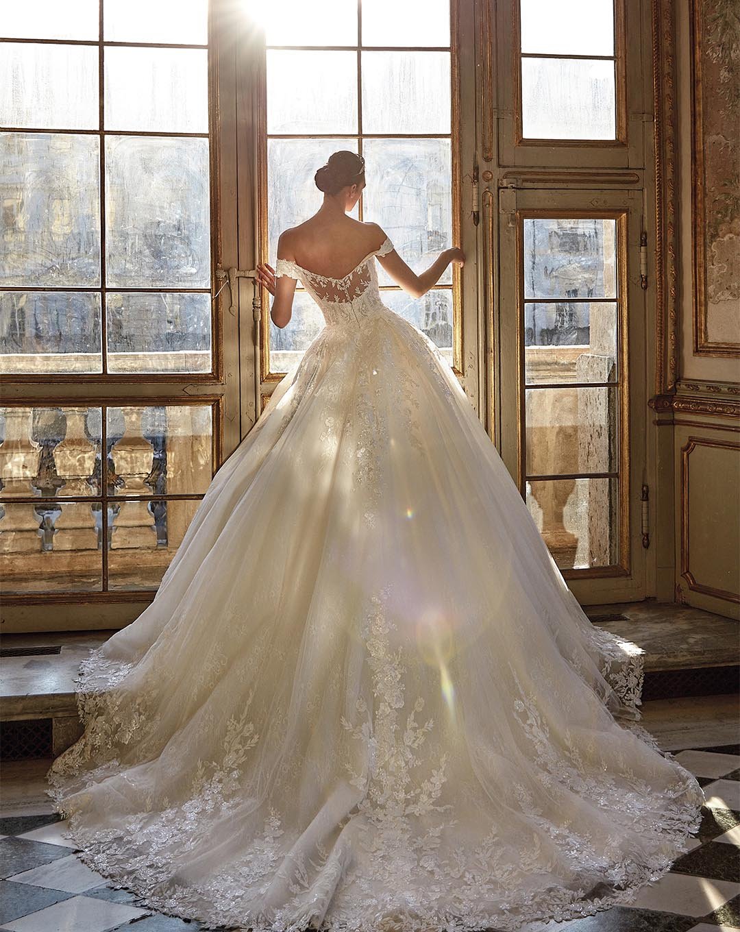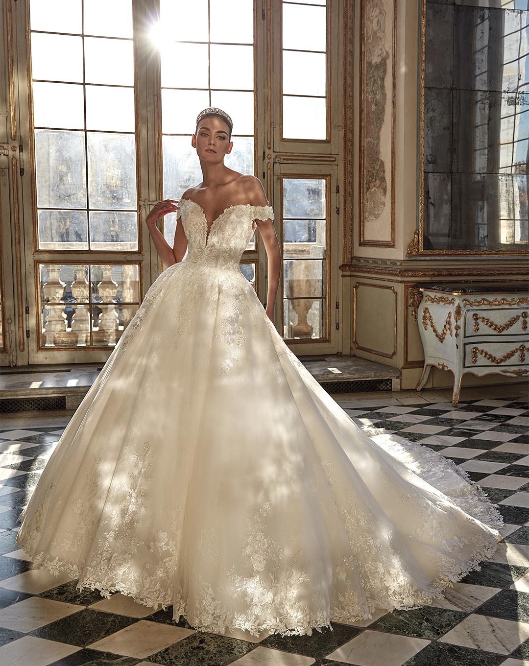 Abito da sposa in stile principesco, impreziosito da ricchi ricami floreali in pizzo che decorano il corpetto e orlano il lungo strascico. Lo scollo a V profondo valorizza la femminilità, mentre la schiena illusion dona un tocco di luce e raffinatezza eterea.