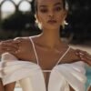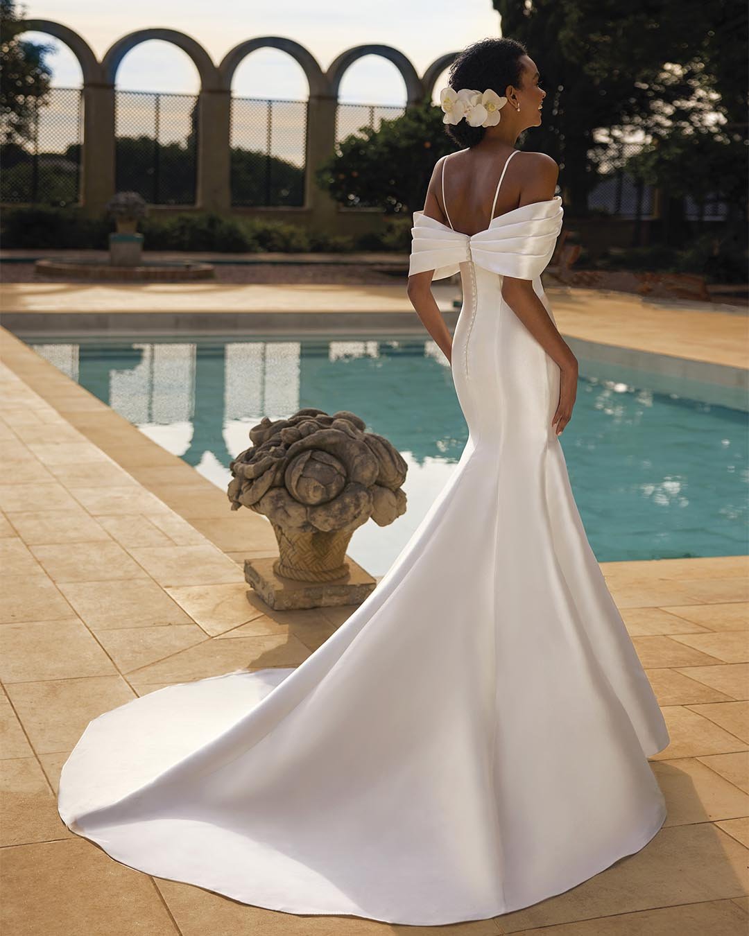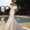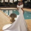 Abito da sposa a sirena in pregiato mikado in seta, con scollatura a spalle scoperte che valorizza il décolleté in modo raffinato. Le linee pulite e la struttura impeccabile del tessuto esaltano la silhouette, mentre il design minimalista dona un’allure moderna e sofisticata.