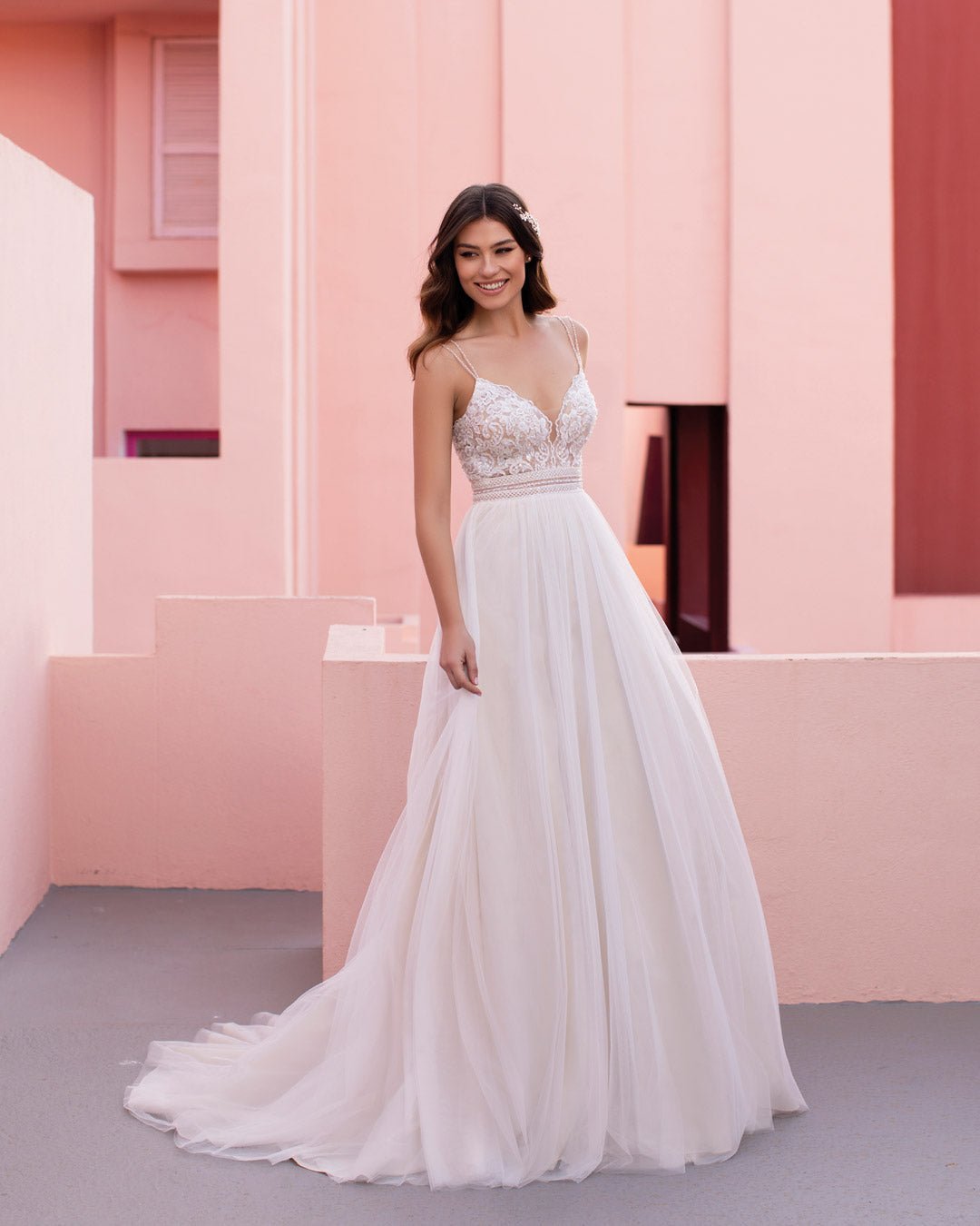 Il tulle ricamato crea un abbinamento celestiale con il corpetto in pizzo e le spalline delicate che incorniciano le spalle e la schiena. Con una deliziosa cinturina semitrasparente che esalta la vita.