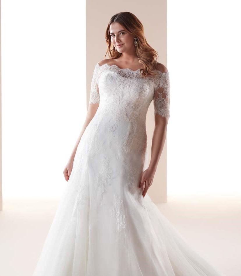 Elegante modello dalla linea redingote, colore avorio, in tulle e dettagli in pizzo rebrodé e chantilly.