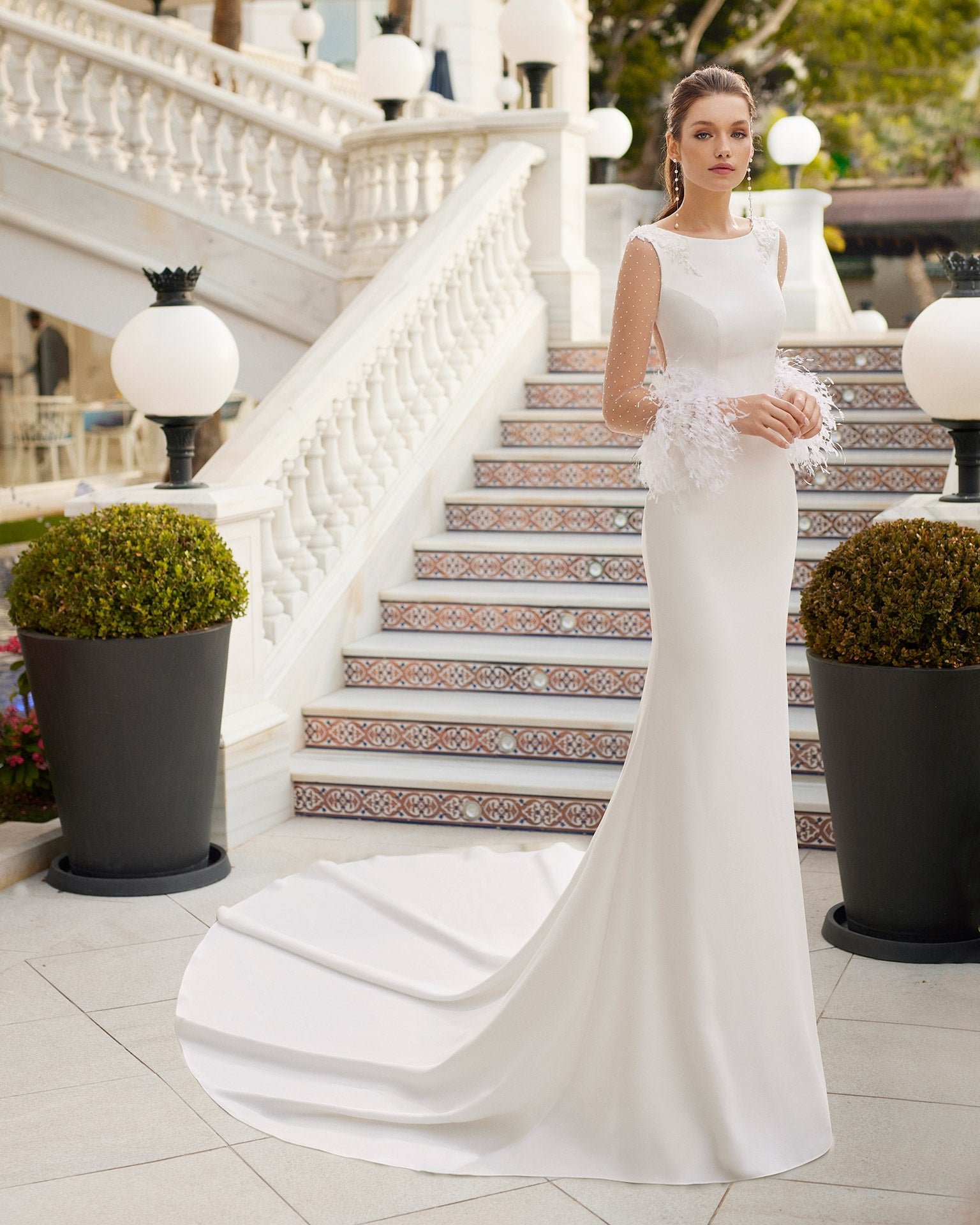 Dalma è un abito da sposa dritto in crêpe dallo stile semplice con scollo a barchetta. Le maniche alla francese e la schiena scoperta con trasparenze lo rendono ideale per un matrimonio civile in autunno. Presenta dettagli di strass, piume e ricami squisiti.