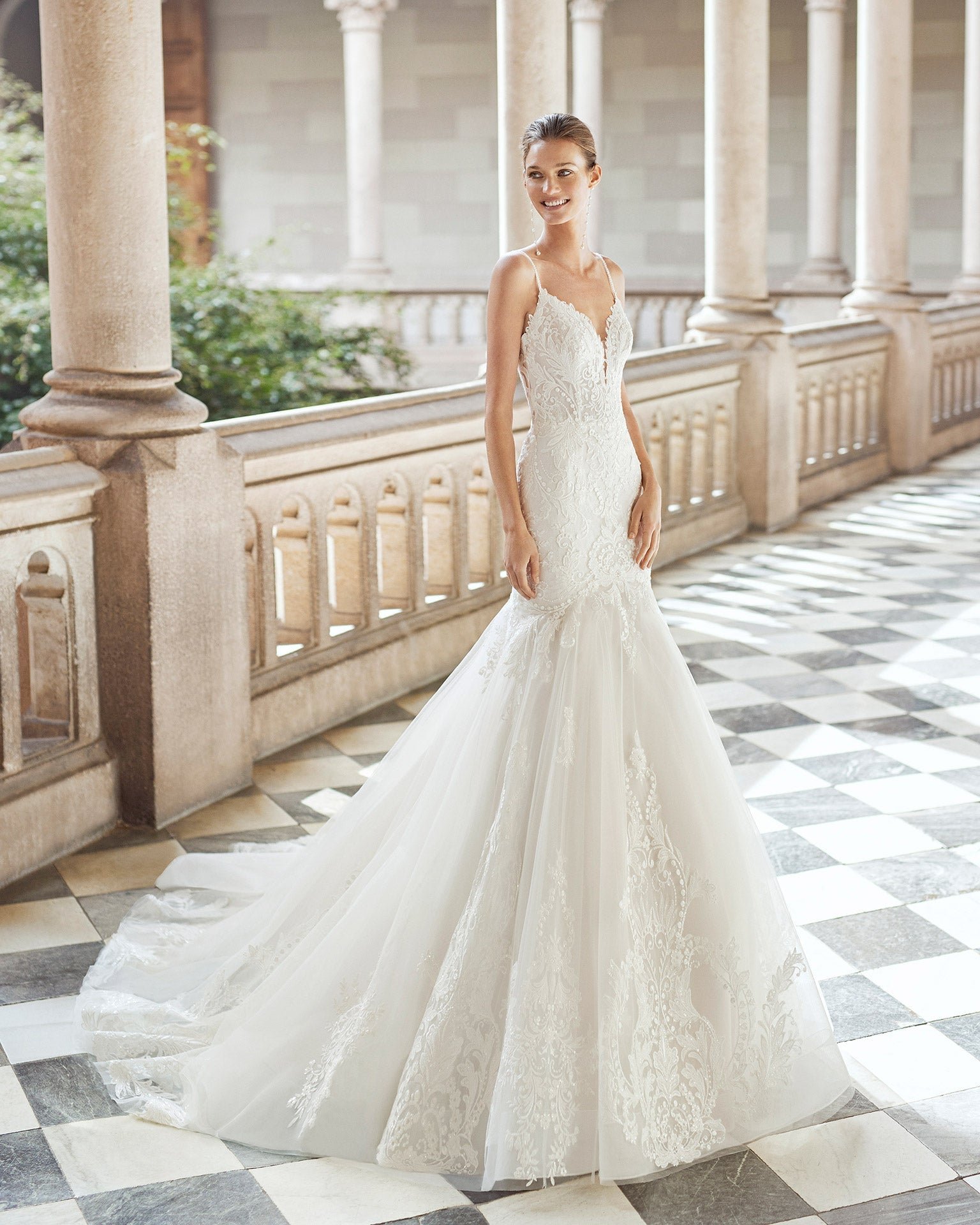 Decada è un vero gioiello per i matrimoni civili in estate. Un modello sirena con scollo profondo e spalline che attraversano la schiena scoperta. Confezionato in pizzo, strass e trasparenze, culmina in un lungo strascico.