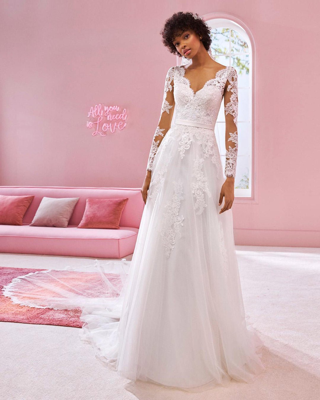 Elegante abito ampio con tagli luccicanti di pizzo francese che rivestono le maniche lunghe. Lo scollo smerlato e il corpetto con scollo a V si intersecano con un’elegante cintura prima di fluttuare lungo la lunga gonna di tulle.