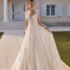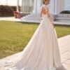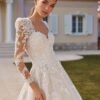 Abito da sposa principesco in tulle, con un corpetto in pizzo riccamente lavorato e scollatura a cuore. Le maniche lunghe in pizzo trasparente donano un tocco di romanticismo e raffinatezza, mentre la schiena a goccia si apre in un elegante dettaglio. La gonna ampia in tulle, impreziosita da applicazioni in pizzo che scendono delicatamente lungo l’orlo, culmina in un sontuoso strascico che rende l’abito sofisticato e senza tempo.