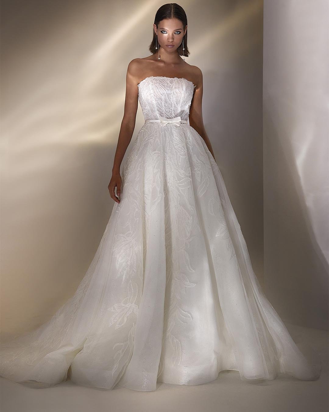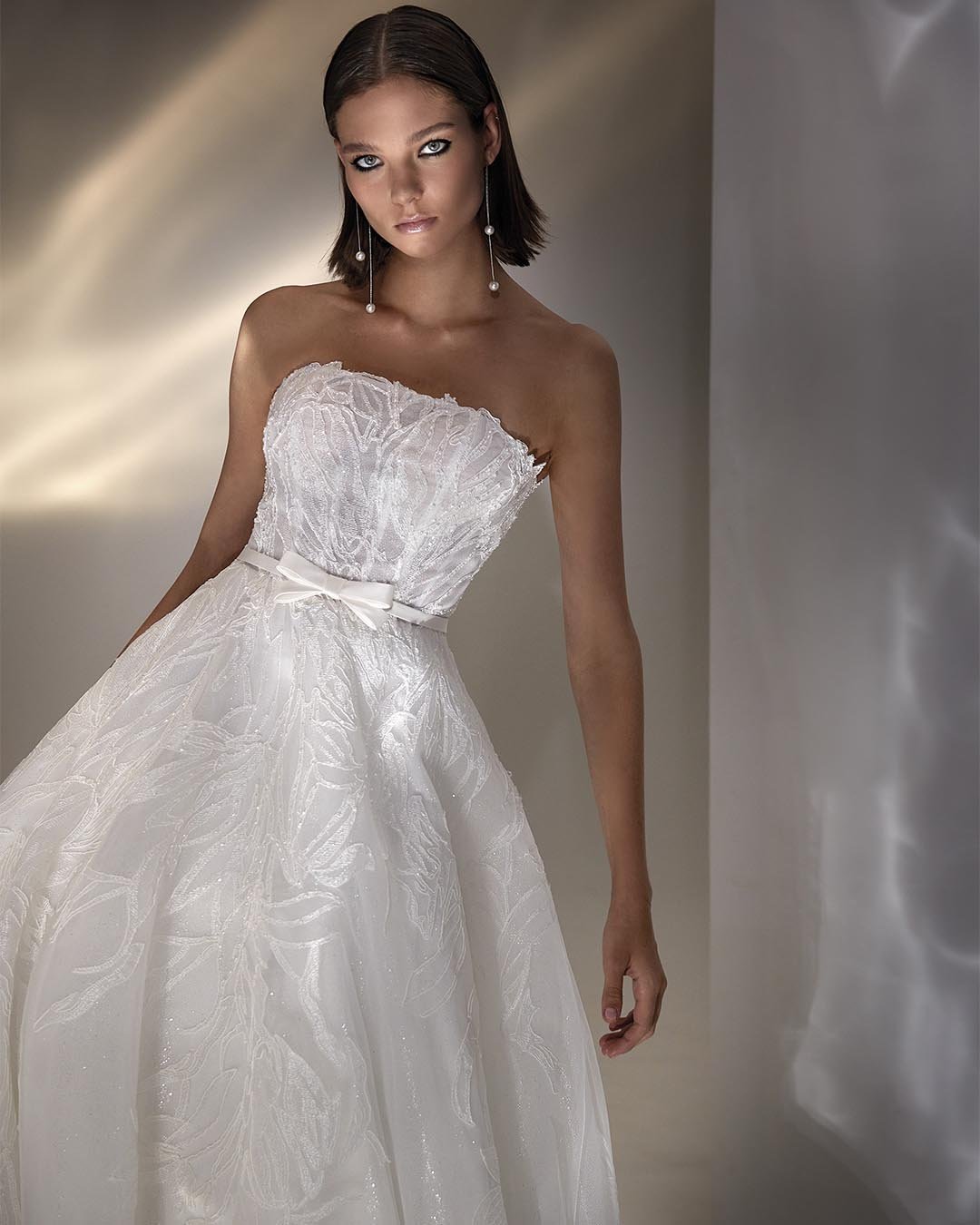 Abito da sposa linea ad A con corpetto senza spalline dal design pulito ed elegante. Realizzato con preziosi ricami in micro perle e tulle, il modello è completato da un delicato fiocco in vita che sottolinea la silhouette. La gonna ampia ed eterea scivola fino a un raffinato strascico, per un effetto regale e senza tempo.