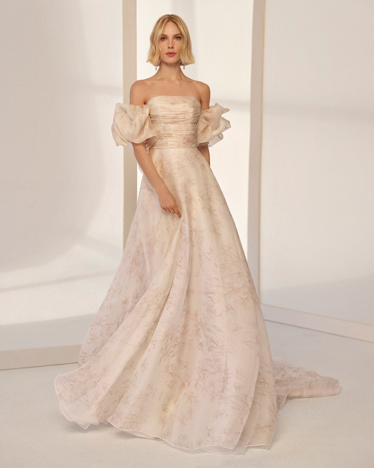 Abito da sposa redingote confezionato in seta d’organza dipinta di fiori di colore bianco; con corpetto drappeggiato senza spalline, manicotti a palloncino rimovibili e grande fiocco irregolare come ornamento sulla spalla. Modello di Aire Atelier di alta moda.