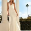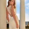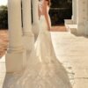 Seducente abito a sirena in crêpe con scollo a V e tulle e trasparenze sulla schiena, abbinato a bellissime applicazioni di pizzo e perline che scendono lungo la schiena e lo strascico.