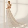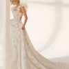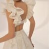 Abito da sposa redingote confezionato in seta d’organza stampata di colore bianco; con scollo quadrato e gonna redingote, maniche con volant. Modello Aire Atelier di alta moda.