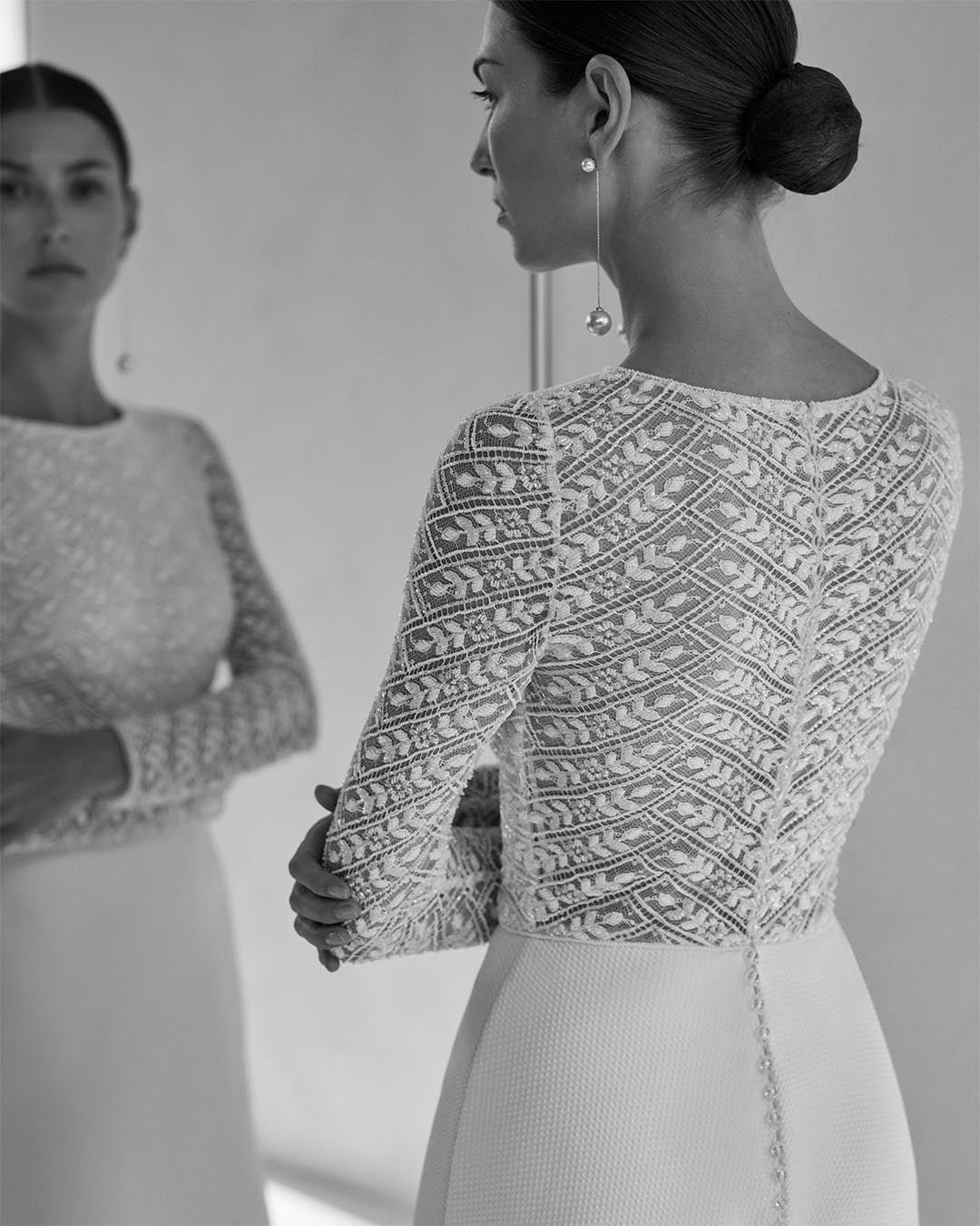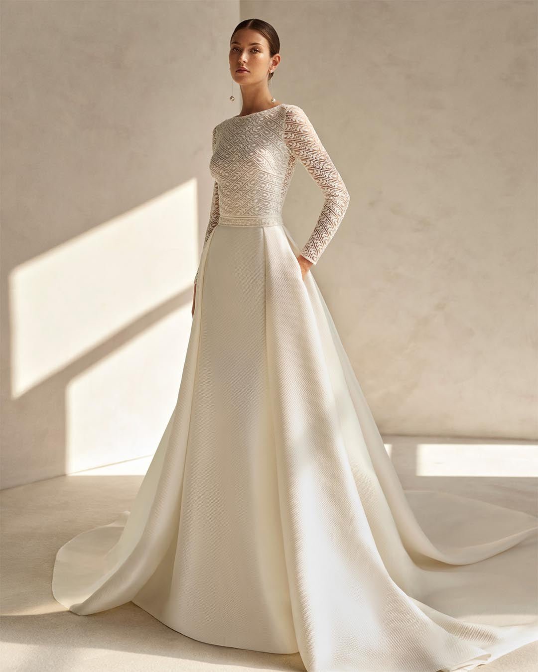 Abito da sposa a due pezzi dal fascino couture, caratterizzato da un’elegante linea svasata. Realizzato in pregiata pizzo ricamato con strass e mikado in seta, presenta un raffinato scollo a barchetta, schiena chiusa e maniche lunghe che avvolgono la figura con classe. Il sopragonna rimovibile in mikado in seta arricchito da strass dona volume e scenografia, permettendo di trasformare l’outfit in un look sofisticato e versatile, perfetto per la sposa che desidera distinguersi con uno stile unico.