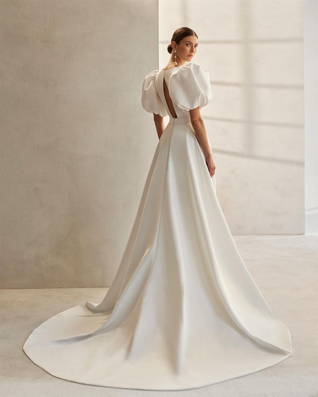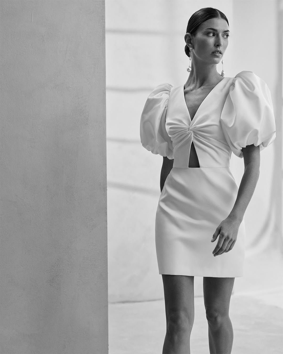 Abito da sposa corto in stile moderno, dalla linea dritta e composto da due pezzi, realizzato in mikado in seta. Il corpetto con scollo a V e la schiena con apertura a goccia si abbinano a raffinate maniche a sbuffo, creando un look fresco e sofisticato. Il modello è reso unico dal cut-out decorativo e dal sopragonna rimovibile, che aggiunge volume e versatilità, trasformando l’outfit da elegante a scenografico.