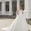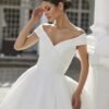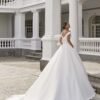 Un bellissimo stile da sala da ballo in shantung croccante presenta un corpetto delicatamente drappeggiato, con spalle scoperte, scollatura a V pudica e una gonna a ruota con un elegante strascico a cattedrale.